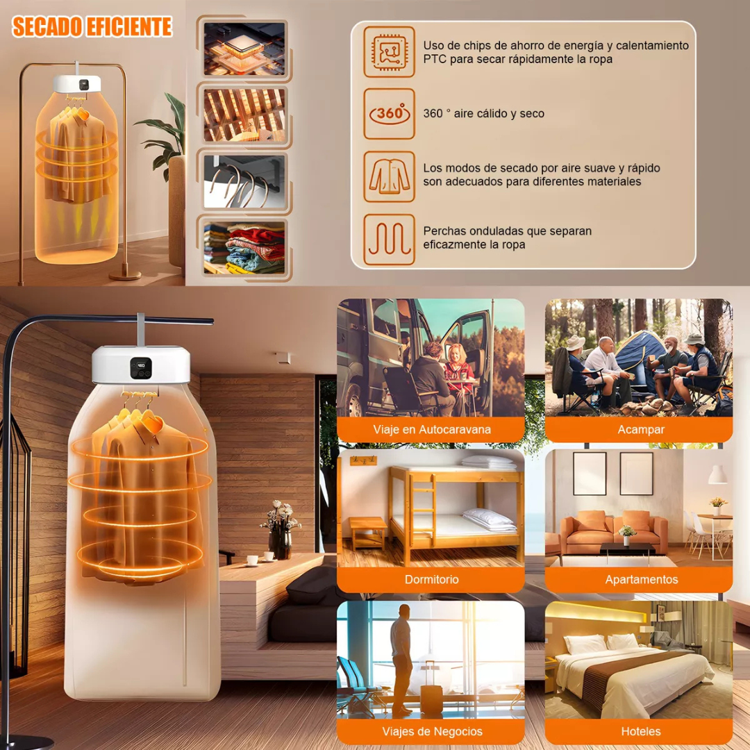 Diseñada para adaptarse a tu estilo de vida moderno, esta secadora portátil combina tecnología avanzada y diseño compacto para ofrecerte un secado eficiente en espacios reducidos. ¡Ideal para apartamentos, viajes en autocaravana, hoteles o uso doméstico!